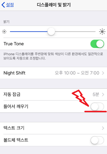 설정에서 들어가시면 일반과 제어센터 바로 아래에 "디스플레이 및 밝기"가 있습니다. 그걸 클릭하시면 들어서 깨우기란 기능이 바로 보이실 겁니다.