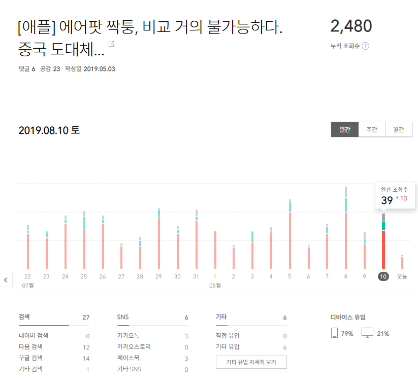 현재 몇 달이 된 글이지만 100개 글 중에서 유입은 적지만 오랫동안 꾸준히 노출되고 있는 글입니다. 생각보다 에어팟 보다는 싸게 판매되고 있는 짝퉁 에어팟의 관심을 가지고 계신 분들이 많아서 많이 찾아주신게 아닌가 한 생각입니다.