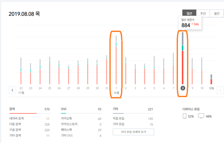 8월달은 1일하고 8일이 제일 많이 유입이 됐습니다. 8일 이때가 갤럭시노트10이 공개가 되면서 많은 분들께서 검색해주고 찾아 주셨습니다.