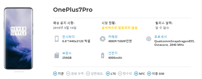출시일은 OnePlus7Pro 4G 버전은 5월 14 발표하고 5G는 바로 추후 바로 공개된다고 합니다.