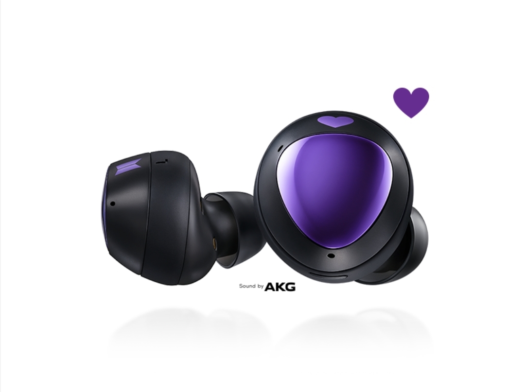 갤럭시 버즈 플러스 BTS는 배터리 충전 케이스를 보면 좀 더 진한 컬러 색상과 전몀에는 삼성로고와 BTS 로고가 박혀있고, 기기 이어폰을 보면 팬층을 위한 하트 로고와 BTS로고가 박혀 있습니다.