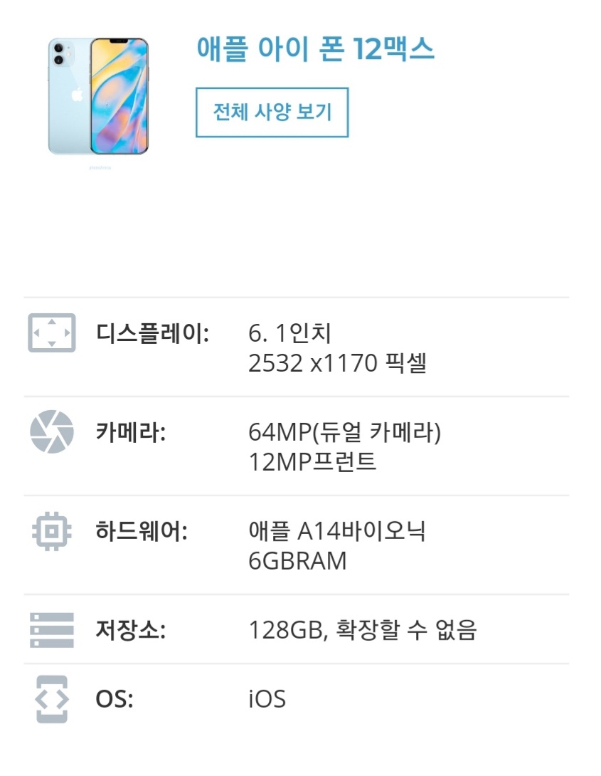 아이폰12 or 맥스 모델의 간단한 스펙을 보면 램과 디스플레이의 해상도, 카메라 화소의 많은 개선이 되었습니다. 기존 전 모델의 램은 3GB의 정말 작은 램용량이 들어갔는데 이번 모델에서는 그 두배인 6GB를 장착되어 출시 되는점이 매우 매력적이였습니다.