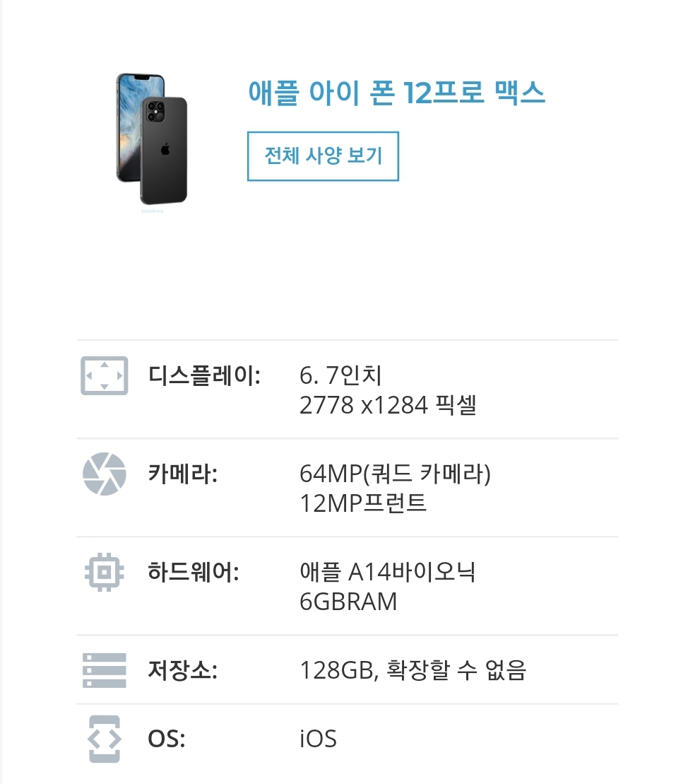 아이폰12 프로 or 맥스의 모델은 일반모델 기기와 프로세서의 차이는 없습니다. 램의 경우 위와 같이 6GB로 나와있는데 프로 시리즈 모델은 8GB 부터 판매가 될 것으로 보이며, 저장소도 마찬가지로 128GB가 아닌 256GB부터 판매가 될것으로 예상 됩니다.