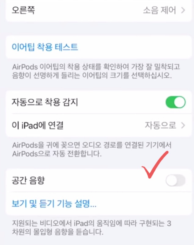 아마 이번 업데이트 내용 중 중심이라 할정도로 극찬 받고 있는 기능인 "공간음향" 기능 입니다. 공간 오디오 기능은 에어팟 프로에서만 지원하는 기능이기에 2세대 제품에서는 호환하지 않는 기능이라 참고 하시면 될것 같아요. 에어팟 기능 중 가장 흥미로운 기능이기도 합니다. 사용하기 전 까지는 어떤 기능인지 감이 오기 전까지는 일반적인 기능이라 생각했지만 체험을 해보니 역대급 업데이트라는걸 깨달았습니다.