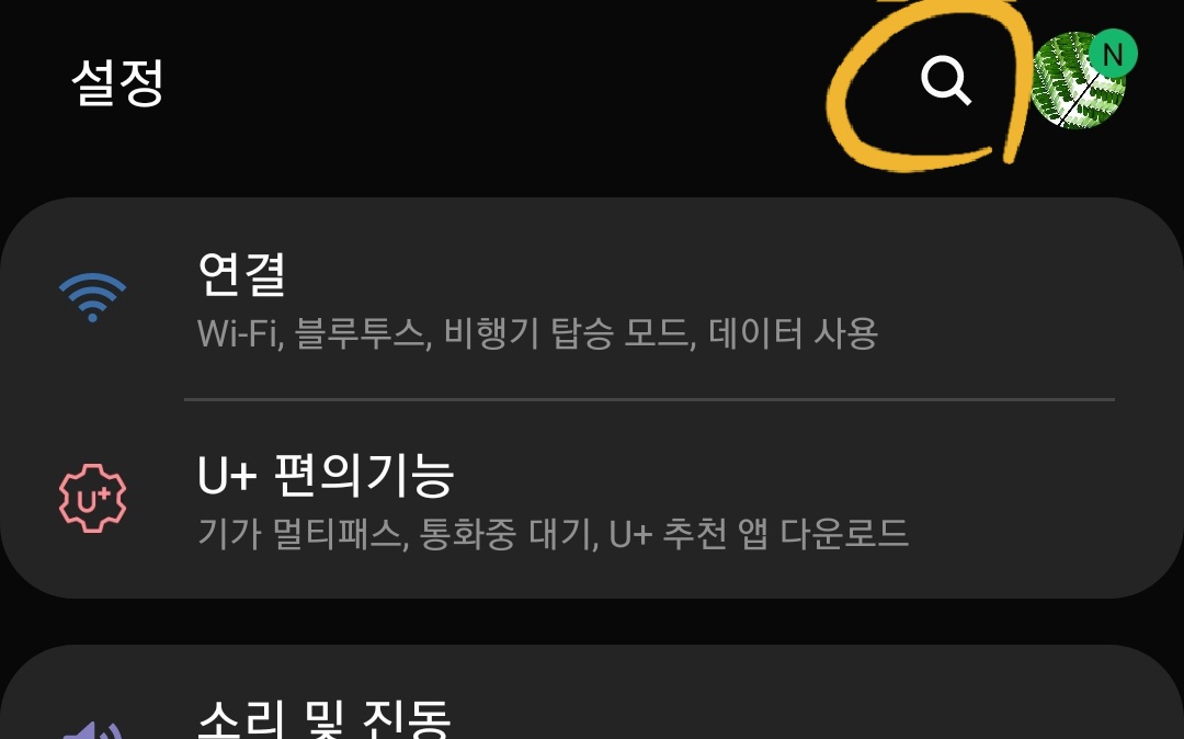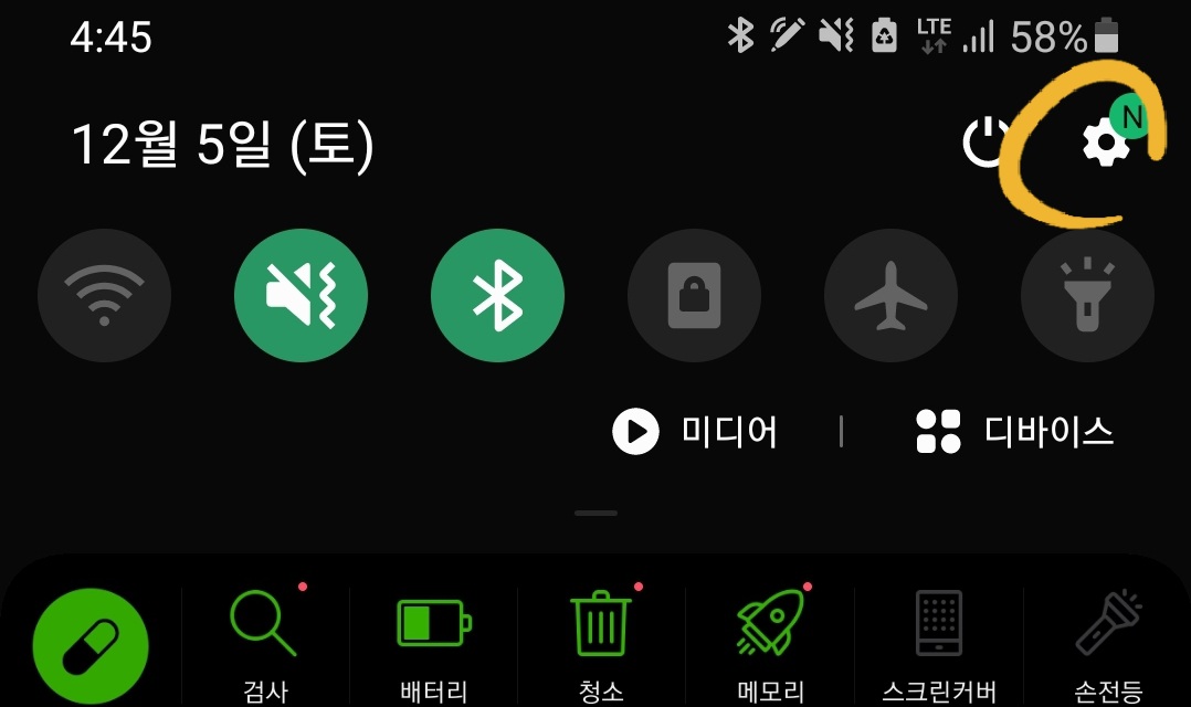 공장초기화를 하기 위해선 스마트폰 기본 앱에 설치되어 있는 "설정"을 들어가 줍니다. 방법은 대체적으로 상단바를 내리면 톱니바퀴 모양과 자신의 앱에 있는 톱니바퀴 아이콘을 들어갑니다.