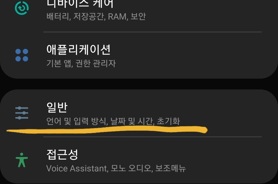 두번째는 설정에서 스크롤을 조금만 하시면 "일반"이라는 설정기능이 있습니다. 들어가주시거나 만약 찾지 못하셨다면 다른 방법으로도 초기화 할 수 있는 페이지로 넘어갈 수 있습니다.