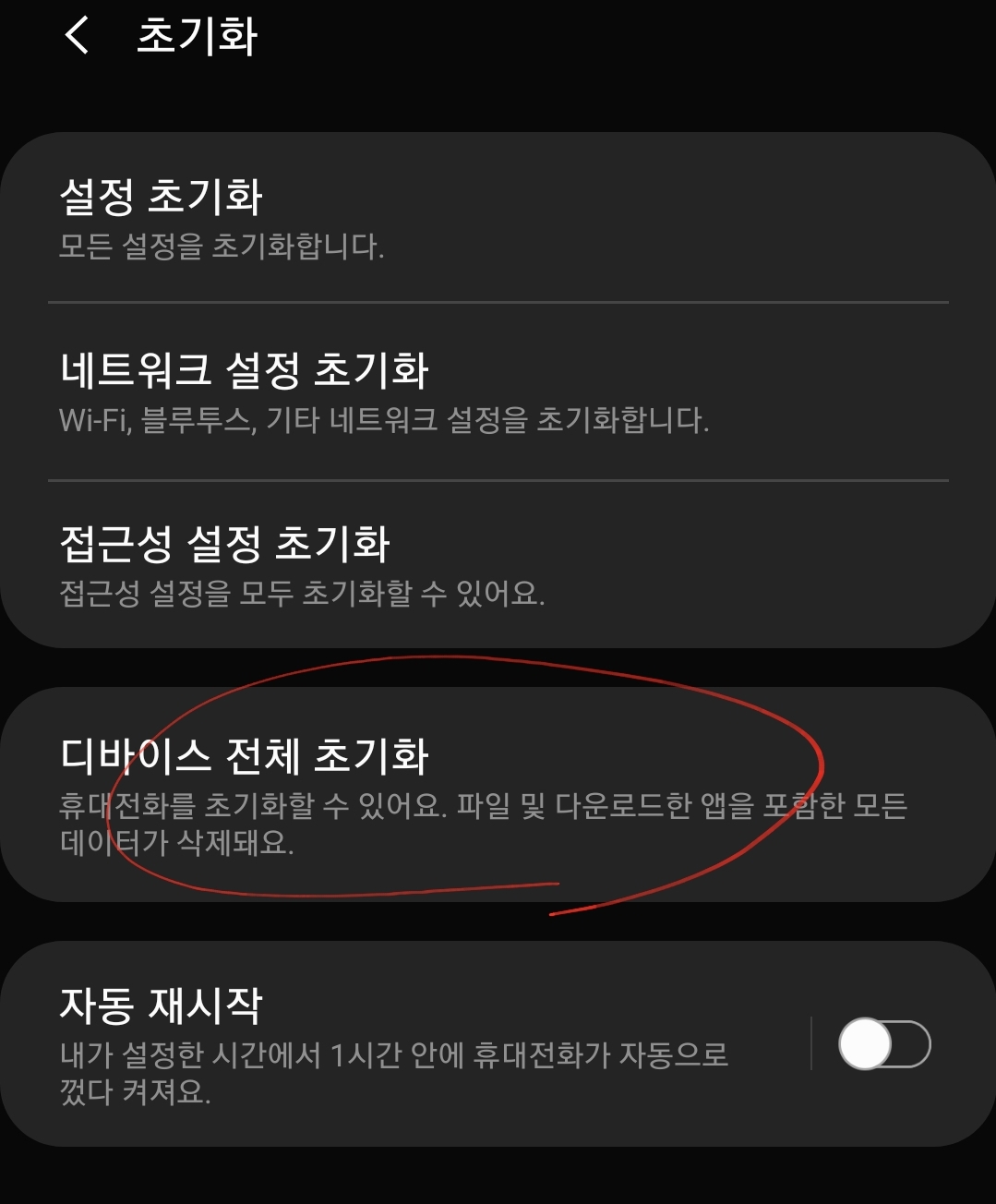 진입을 하셨다면 여러 가지 초기화 기능 목록을 보실 수 있는데 상황에 따라서 초기화를 할 수 있는 범위가 다르겠지만 대체적으로 디바이스 전체 초기화를 하여 새 폰처럼 그대로 설정되어 초기화를 하실 수 있습니다. 디바이스 전체 초기화 기능이 "공장초기화"랑 같은 기능 입니다.