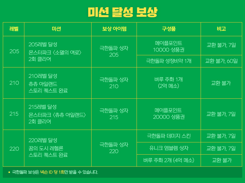 극한돌파 캐릭터는 205부터 미션 보상이 주워지는데 메이플 포인트랑 극한돌파 성장비약이 가장눈에 띄네요 220까지 쉽게 레벨업을 할 수 있는 이벤트를 처음 시도를 하고 신규 유저와 복귀유저를 저격한 이벤트라 그런지 새벽에도 정말 사람이 많네요. 다음 게임의 이벤트 소개는 던파 여름방학 이벤트가 어떤 이벤트를 하는지 간단하게 소개해드리도록 하겠습니다.
