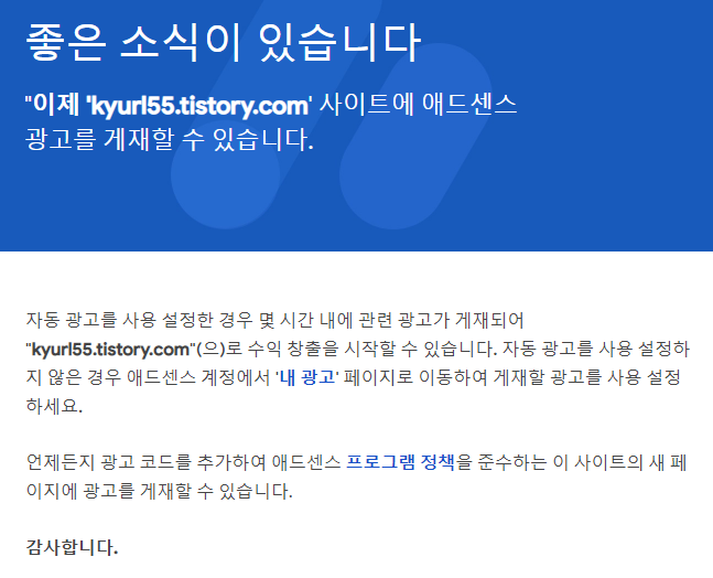 티스토리의 꽃은 애드센스 광고를 넣어서 수익을 창출하는 방법입니다. 모두가 수익 창출하기 전 수익을 얻을 수 있는 플랫폼인 애드센스는 모두에게 광고를 달수 있게 승인을 쉽게 해주진 않습니다. 여러분이 알고 있듯이 유입수가 늘어나고 있고 블로그가 어느 정도 노출이 되면 광고를 달수있으니까 무작정 하시는 분들이 많습니다. 하지만 여러분들이 겪었듯이 아마 티스토리를 처음 하시거나 블로그를 운영을 안 해보신 분들은 80퍼센트가 다 승인 신청에 떨어지셨던 경험이 있으실 겁니다. 저 또한 떨어졌던 사람 중 한 명입니다.