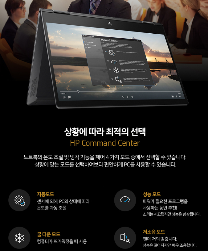 HP ENVY X360 13 노트북은 온도 조절 및 냉각 기능등 4가지 모드 중에서 선택을 하여 자신의 입 맞게 편안한 PC를 사용할 수 있습니다. 자동모드, 성능 모드, 쿨 다운 모드, 저소음 모드 4가지 기능이 있는데 냉각 기능인 쿨 다운 모드가 제일 맘에 드는 기능이네요.
