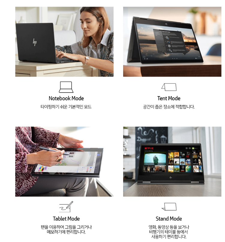 HP ENVY X360 13 노트북은 그냥 슬림 노트북이 아닌 360도로 회전하면서 태블릿 느낌처럼 사용이 가능합니다. 추가로 펜이 있기에 간단한 그리기나 필기 같은 생활의 빌표한 기능들이 있기 때문에 다른 노트북들보다 휴대와 기능으로서 탁월하게 가지고 있는 노트북입니다.