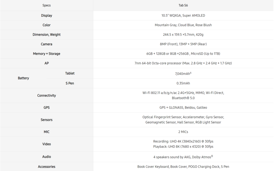 본론으로 들어가 바로 스펙을 보면 갤럭시탭 S6는 10.5인치를 가지고 있으며 WQXGA 슈퍼 아몰레드 디스플레이를 가지고 있습니다. 무게는 420g이며 10.5인치의 크기를 가지고 있는데 420g이면 가벼운 무게이기에 휴대하기에는 무리없이 충분히 들고 다닐 수 있습니다. 두께는 5.7mm의 정말 얇은 두께를 가지고 있어 들고다니기에도 편리하게 제작이 되었습니다. 램과 스토리지는 기본 모델 6GB + 128GB를 지원하고 옵션 추가된 모델은 8GB + 256GB 모델을 지원합니다. 배터리는 7040mAh 배터리가 탑재 되었습니다. 전작 대비 조금 배터리 용량이 줄어들었지만 최적화로 배터리가 많이 달거나 하지는 않을것 같습니다. S펜의 배터리는 0.35mAh 배터리고 펜꺼내고 대기시간이 10시간정도 버틴다고 합니다.